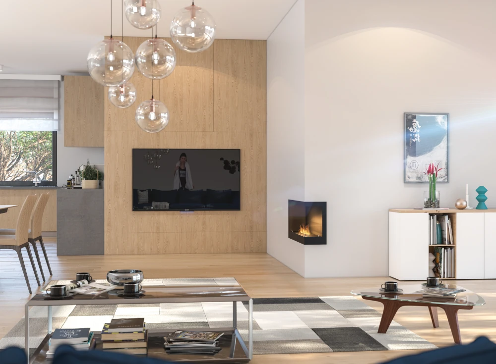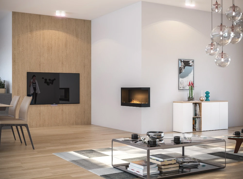 See atraktiivne seina sisse süvistatav parempoolse nurgaga biokamin sobib ideaalselt korterisse, eramusse, hotelli, restorani ja teistesse interjööridesse kuna see ei vaja korstnaühendust ega spetsiaalset ventilatsioonisüsteemi. Bioetanool põleb puhtalt (ei lõhna, ei suitse, ei tahma) ja on usaldusväärne ning ohutu.