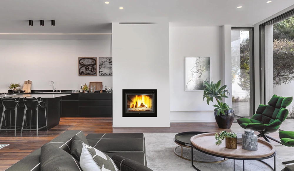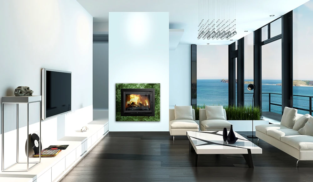 Kaminasüdamiku suur klaasuks võimaldab nautida elavat tuld aga lisaks sellele saad nautida ka hubast soojust kuna soojuse paremaks ja pikemaaegsemaks eraldamiseks on kaminasüdamiku pinnal tihedalt asetsevad ribid.