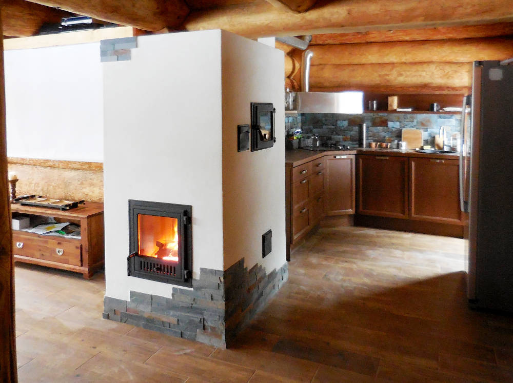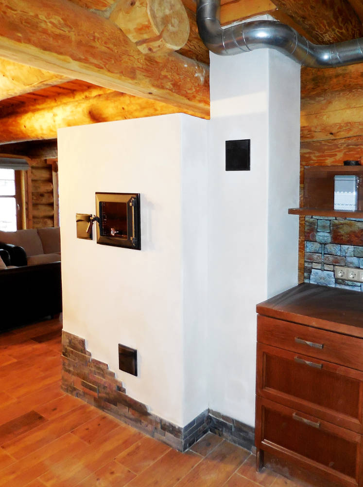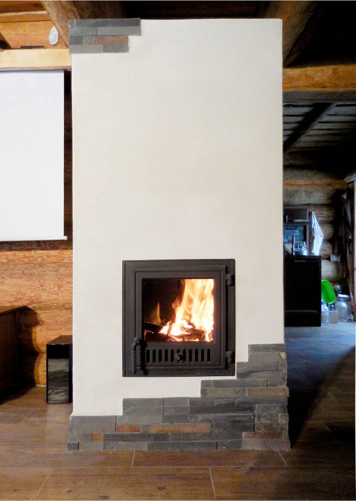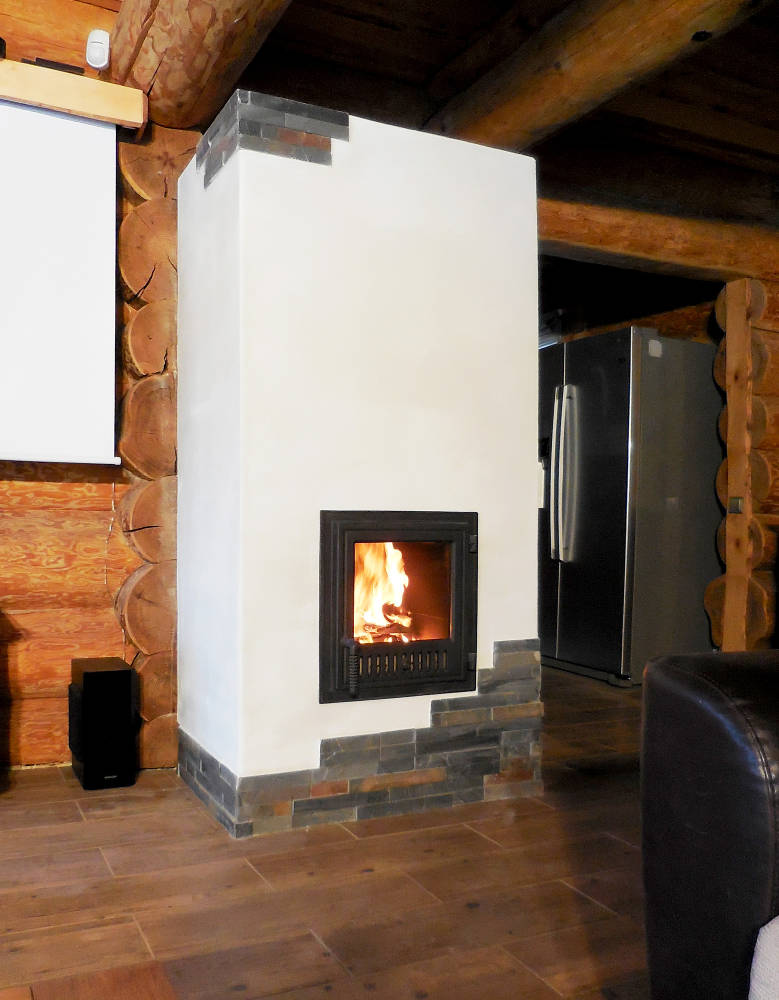 Ahju koldeks on umbkolle, mille ehitamiseks kasutasime spetsiaalseid soonega koldekive. Kolde temperatuuri tõstmiseks ja puhtama põlemise tagamiseks kasutasime keraamilist koldelae peeglit. Ahju viimistlesime antiikkrohvi ja looduskiviga.
