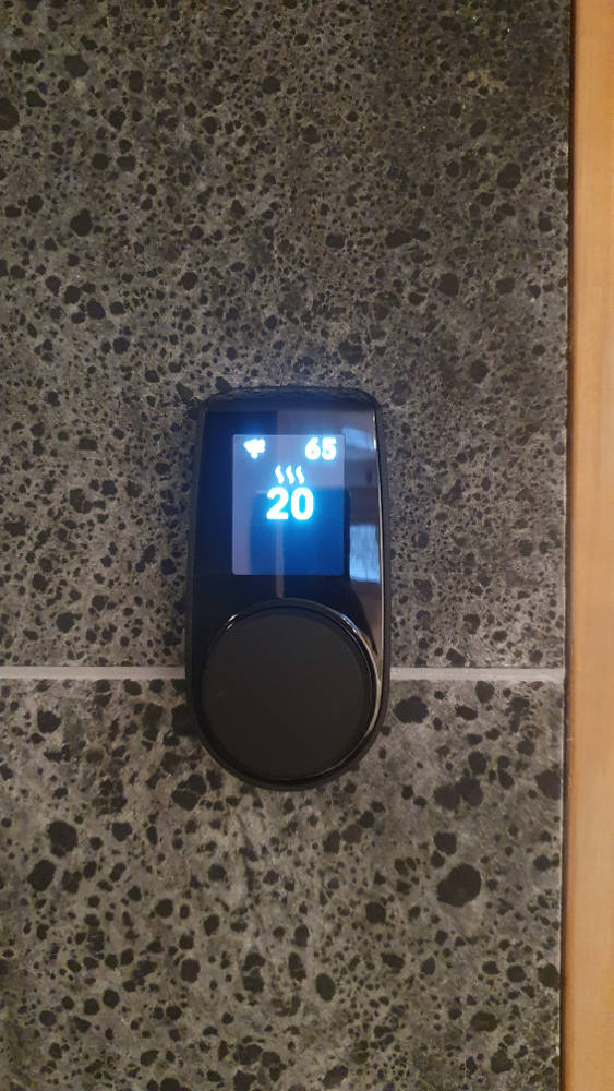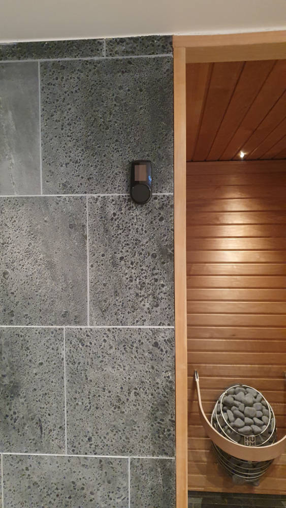 Lokaalseks kerise juhtmiseks mõeldud juhtpult UKU Local leidis endale koha kohe saunaukse kõrval, kus on mugav sauna sisse- ja välja lülitada, temperatuuri määrata ja jooksvalt seda jälgida.