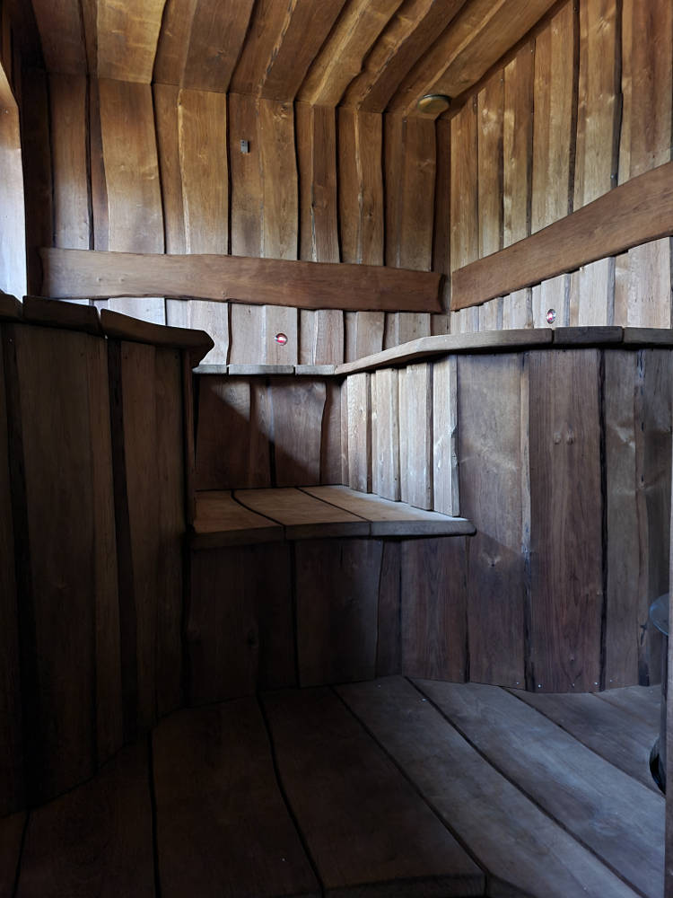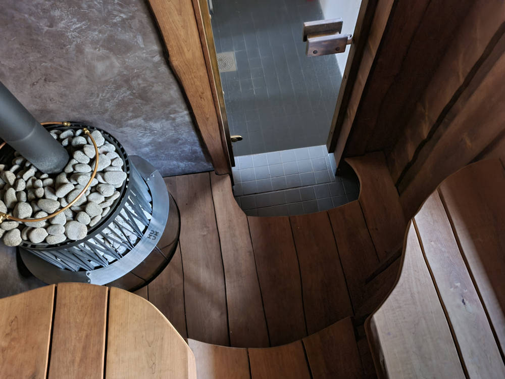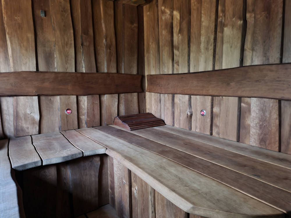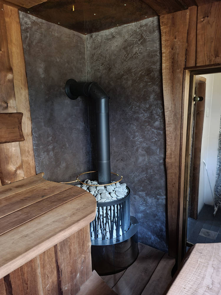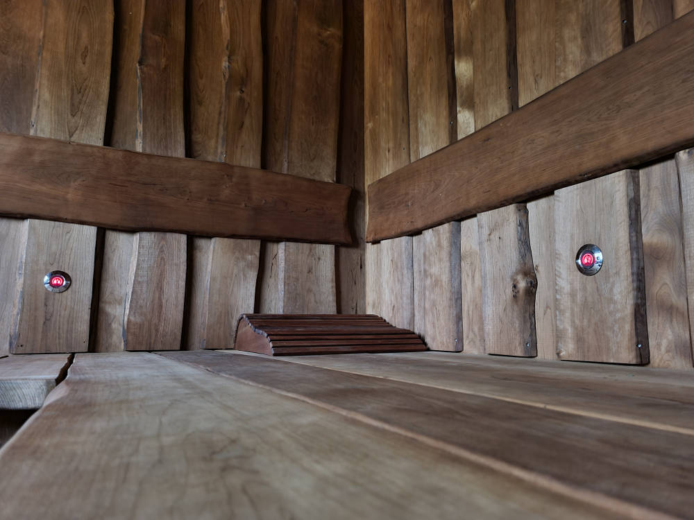 Saunalava ja seinad valmistasime termotöödeldud lepalauast ja -plangust. Iga laud on hoolikalt valitud ja vormitud selliselt, et sein ja lagi omavahel kokku sulanduks. Õdusat valgust annavad seljalaua taga ja laes asetsevad kiudoptilised valgustid.
