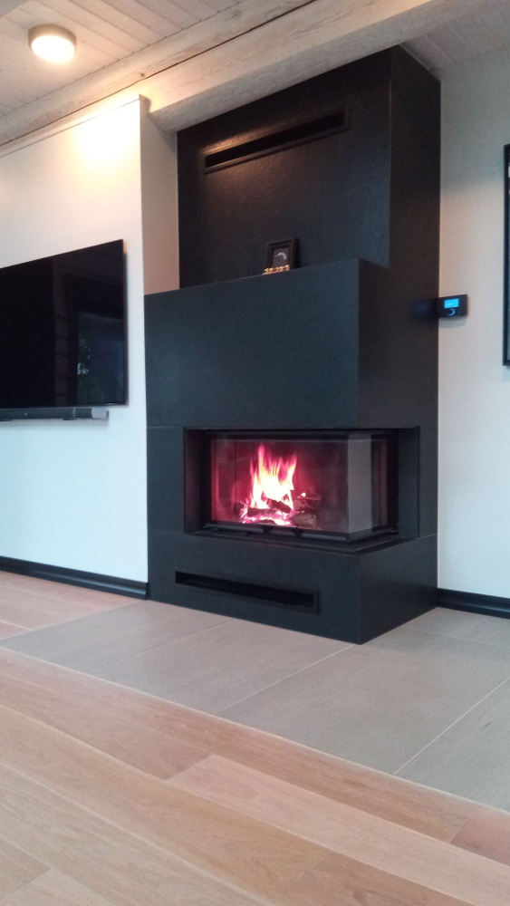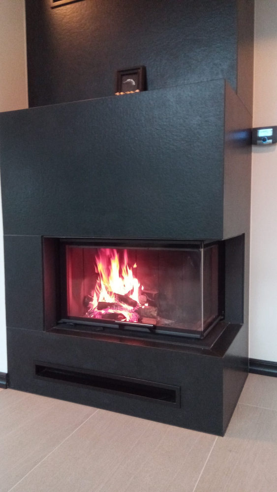 Mustast graniidist kamin, millel on Romotop südamik, Nero Assoluto graniidist väliskest ja kütteautomaatika. Kaminaomanikul ei jää üle muud, kui puud…