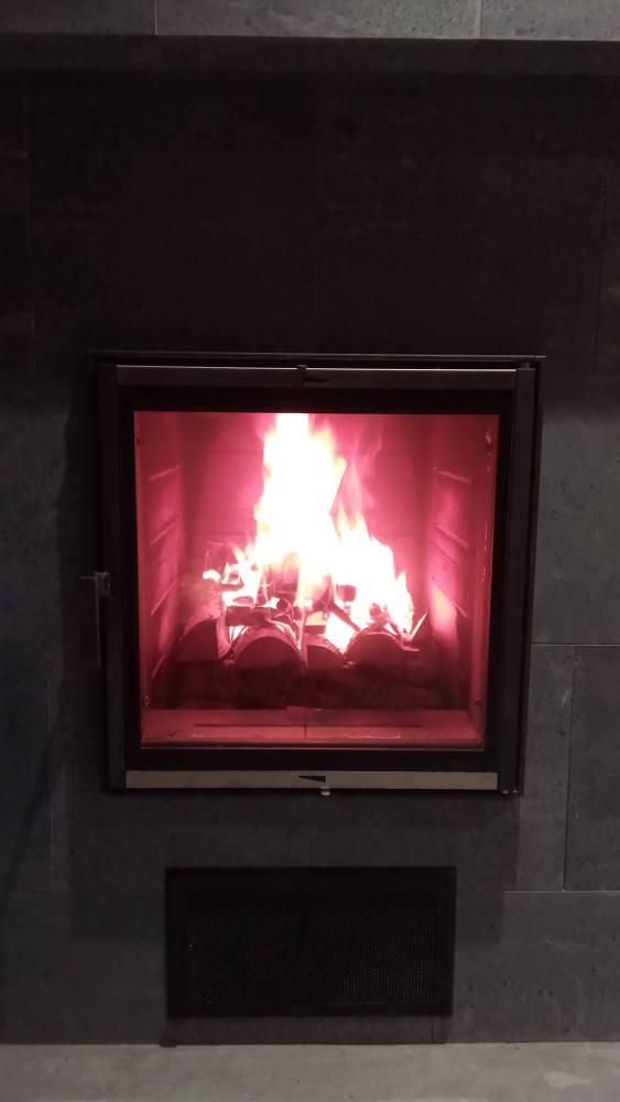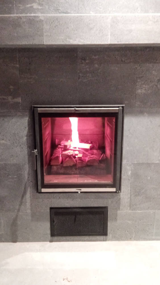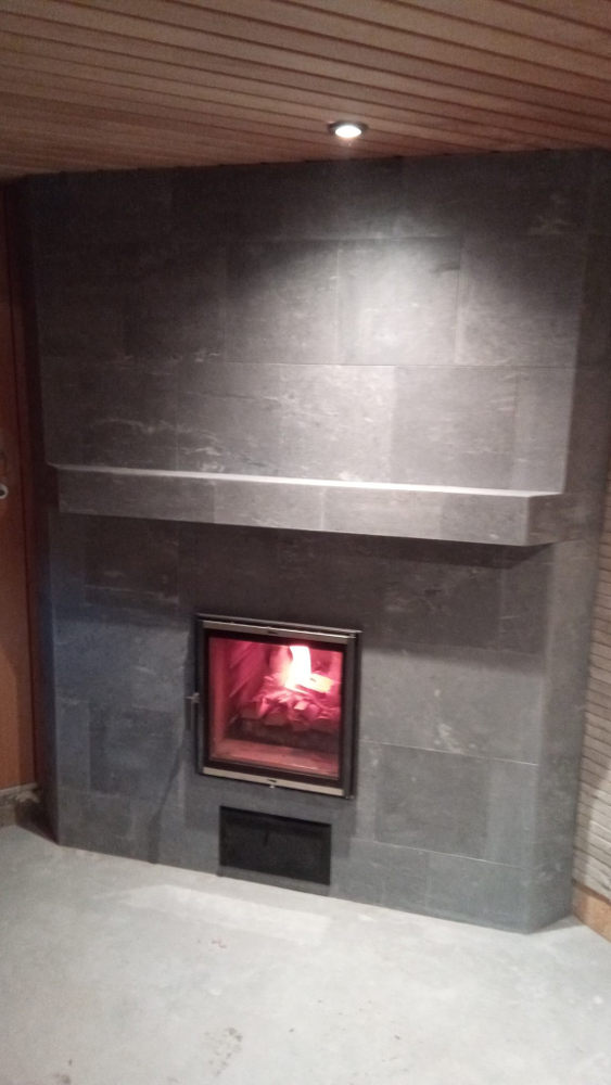 Ühe võimsa kerise eelkolle saab olla ka selline – sauna puhkeruumis kamin aga leiliruumis kuum! Kamina viimistlesime voolukivi plaadiga.