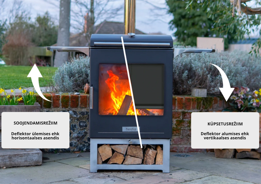Antud välikaminal-grillil on innovaatiline integreeritud deflektorsüsteem, mis võimaldab reguleerida kuumuse suunda ehk annab võimaluse valida soojendamis- või küpsetusrežiimi vahel. Asetades deflektori küpsetusrežiimile, suunatakse kuumus üleval olevale grillile, hoides samaaegselt klaasi puhtana ja kaitstes grillijat otsese kuumuse eest. Küpsetusrežiimis olles saab termomeetri abil mugavalt jälgida küpsetustemperatuuri. Soojendamisrežiimi jaoks saab deflektori üles tõsta, mis võimaldab nautida puidu põlemisest tekkivat soojust ja esteetilist leekide mängu.