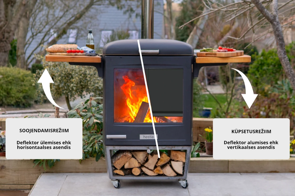 Antud välikaminal-grillil on innovaatiline integreeritud deflektorsüsteem, mis võimaldab reguleerida kuumuse suunda ehk annab võimaluse valida soojendamis- või küpsetusrežiimi vahel. Asetades deflektori küpsetusrežiimile, suunatakse kuumus üleval olevale grillile, hoides samaaegselt klaasi puhtana ja kaitstes grillijat otsese kuumuse eest. Küpsetusrežiimis olles saab termomeetri abil mugavalt jälgida küpsetustemperatuuri. Soojendamisrežiimi jaoks saab deflektori üles tõsta, mis võimaldab nautida puidu põlemisest tekkivat soojust ja esteetilist leekide mängu.