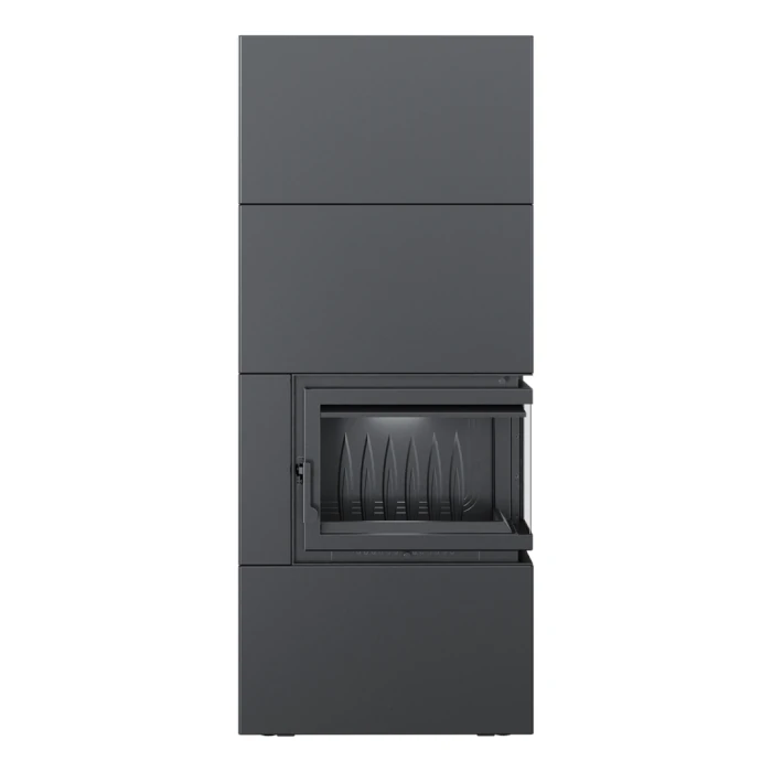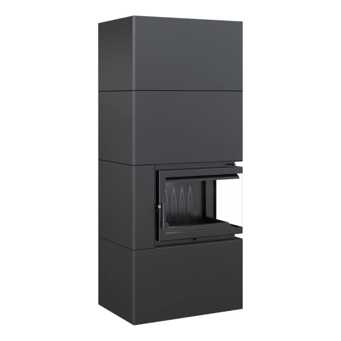 Nurgaga Kratki Simple Box 8 R valmiskaminal on terasest musta värvi väliskest, mis hakkab kiirelt ümbritsevasse ruumi soojust eraldama. Kaminasüdamikul on stiilne ja suure klaaspinnaga paremale küljele avanev uks, mis võimaldab elavat ja hubast tuld nautida kahest küljest korraga.